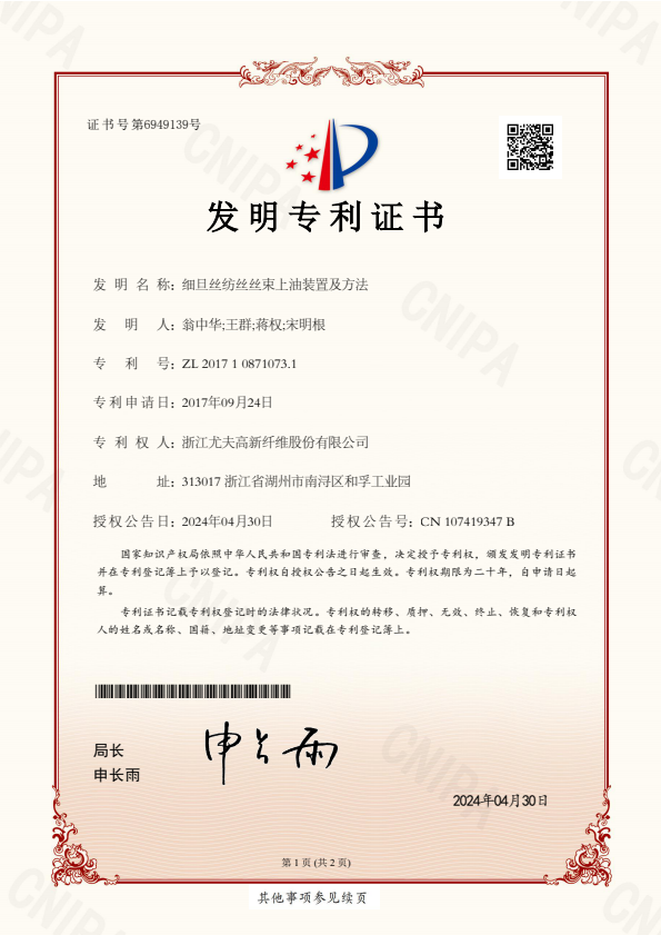 發(fā)明專利證書細(xì)旦絲紡絲絲束上油裝置及方法