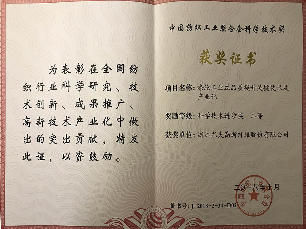 中國紡織工業聯合會科學技術獎二等獎2018.10